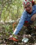 Biologist, Jennifer Valiulis, , takes a caliper measurement of a federally endangered catesbaea melanocarpa during rapid assessment of the polulation.